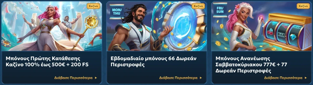 - Μπόνους καλωσορίσματος: 100% έως €200 + 50 δωρεάν περιστροφές σε επιλεγμένα φρουτάκια.